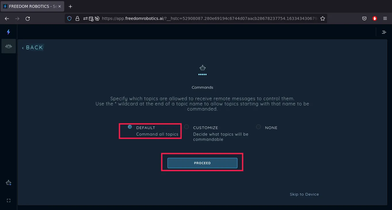 The first step is to configure what topics will be allowed to receive commands from Freedom Robotics. This is useful if you want to add commands for buttons on the joystick (e.g make a photo when pressing the square button), or if you want to pilot the robot using the UI joystick in Freedom Robotics. You have 3 options: