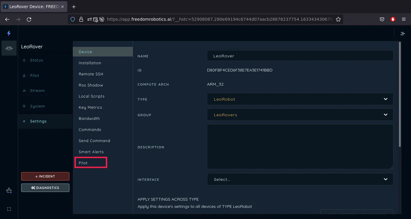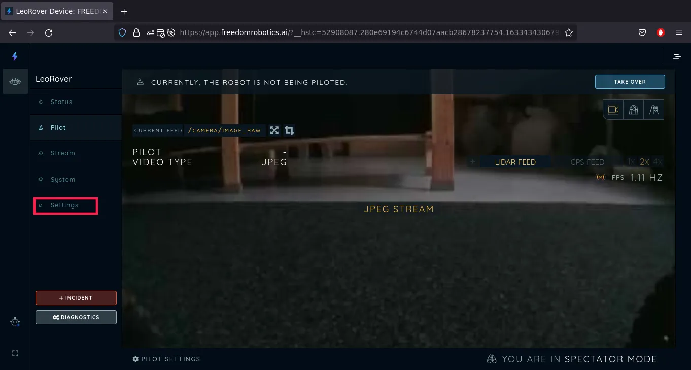 Now we see that the device is connected, although not active even though our rover is still turned on. That's because Freedom Robotics doesn't get any info from any topics from the robot. After the configuration, the robot will be visible as active. So now, from the robot's menu, we go to Settings.